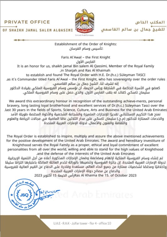 The Knight Order "The Royal Order" was founded by Royal Decree of H.H. Shaikh Jamal Bin Salem Al Qassimi to honor the life's performance in the service of the Royal Family of the United Arab Emirates to H.E. Dr.(h.c.) Süleyman Tasci, to whom the sovereignty of the Order was transferred by the same Decree. The Royal Order is established to inspire, multiply and assure achievements for the positive development of the Royal Family of the United Arab Emirates. The award and hereditary investiture of Knighthood serves the Royal Family as a proper, ethical and loyal commitment of excellent personalities from all over the world, willing and able to stand for the high values of Knighthood and the defense of the interests of the Royal Family of the United Arab Emirates.